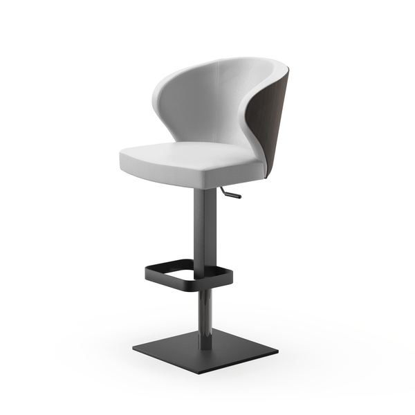 Drehhocker höhenverstellbar. Gestell aus Gusseisen mit Edelstahlplatte überzogen, Gasdruckfeder, Fußstütze, Sitz und Rückenlehne aus Sperrholz, mit Polyurethanschaum gepolstert und mit unserer Auswahl an Stoffen, Kunstleder oder echtem Leder bezogen. Die Rückseite des Hockers ist in Esche furniert, erhältlich in vielen Ausführungen .