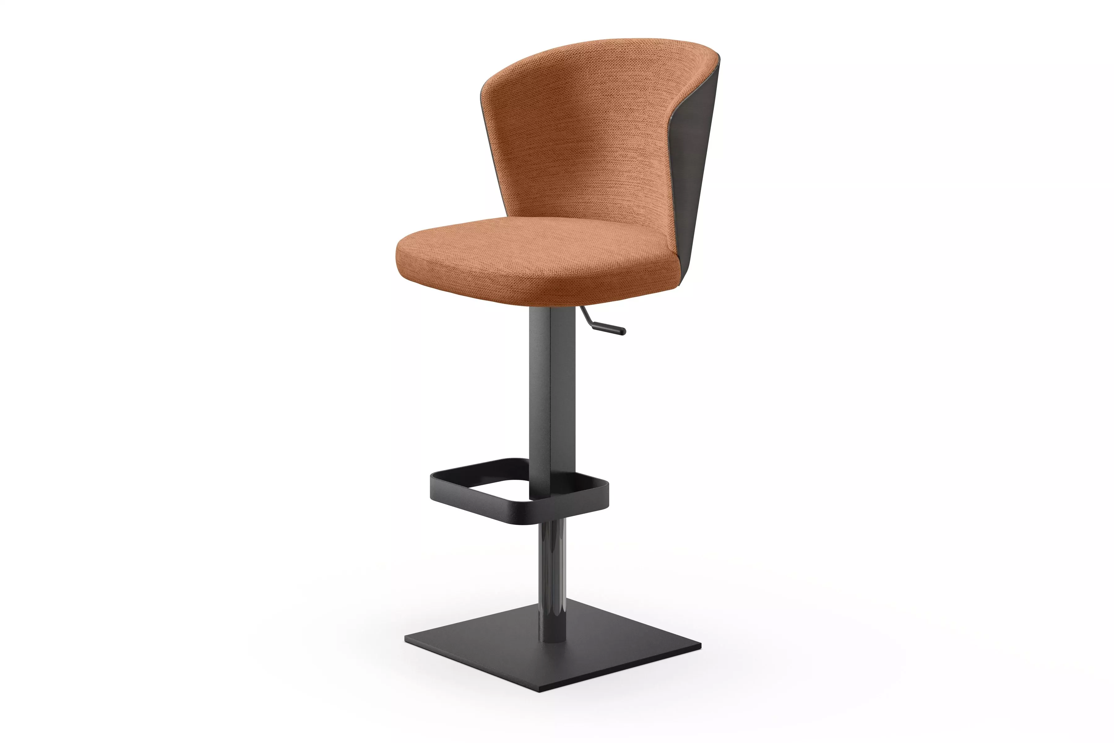 Adjustable height swivel stool.Cast iron base covered with stainless steel plate, gas lift, footrest, plywood seat and back, polyurethane foam upholstered with fabric, leatherette or real leather. Back side of stool’s back is in Ash Plywood at sight and is available in many finishes.