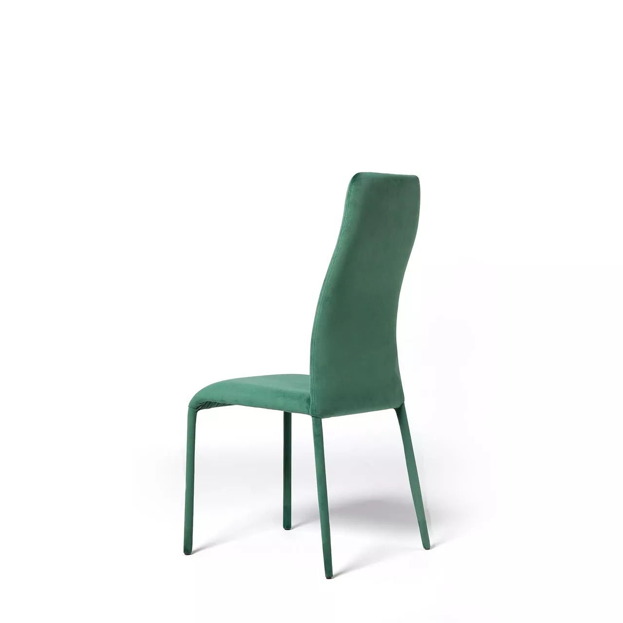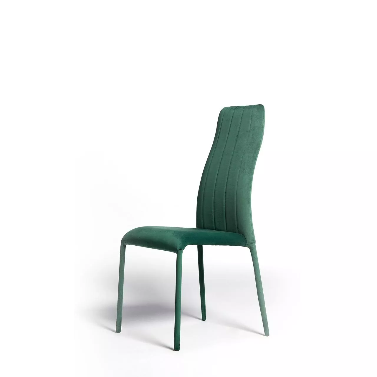 Sedia da sala con struttura in tubo d’acciaio interamente rivestita in gomma poliuretanica e tappezzata in stoffa, velluto, finta pelle e vera pelle bovina di origine italiana. Disponibile anche con gambe verniciate.