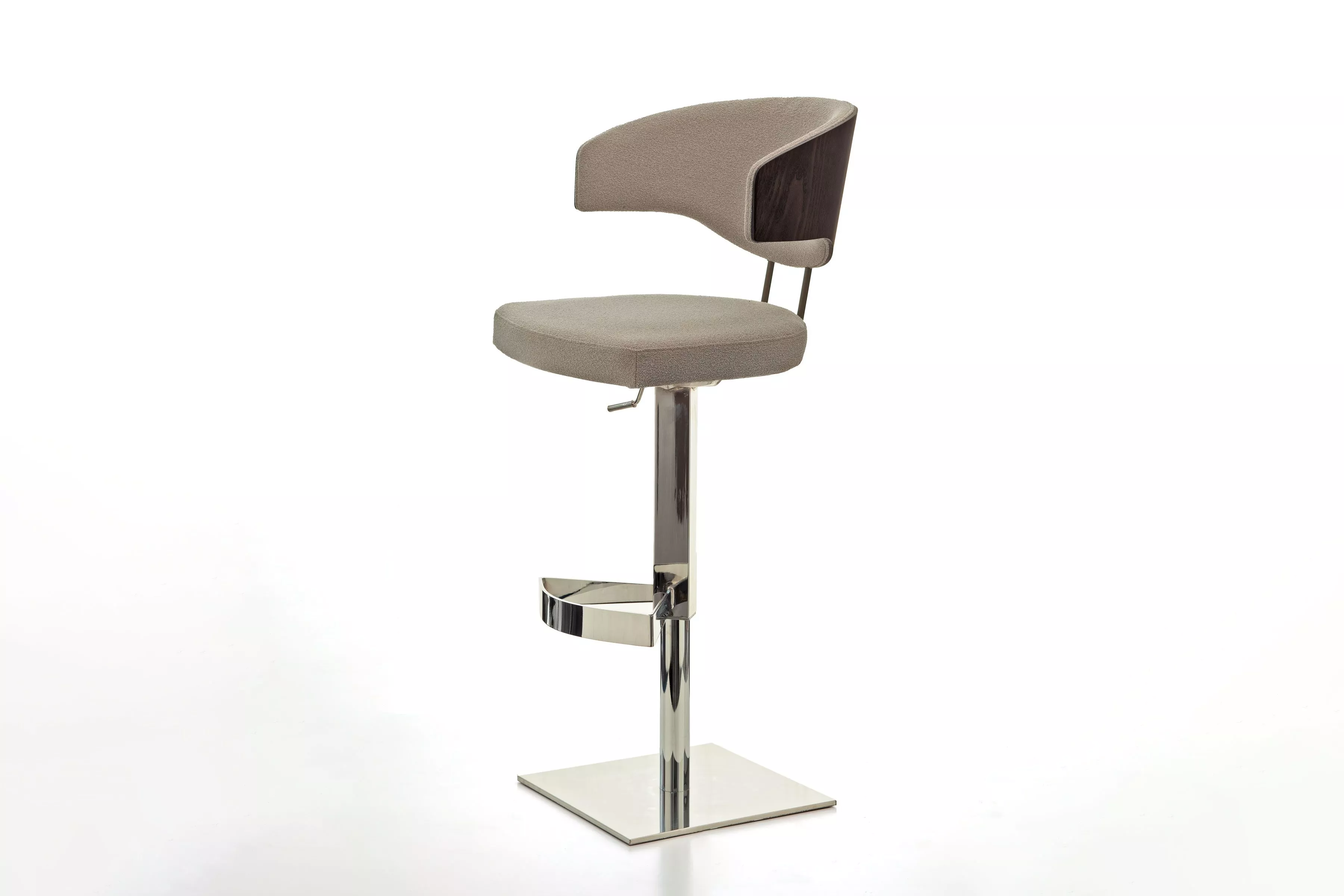 Tabouret pivotant et réglable en hauteur. Base en métal disponible en 10 versions, et assise et dossier tapissés en tissu, synthétique ou cuir. La partie arrière est en Frene multipli a vue.