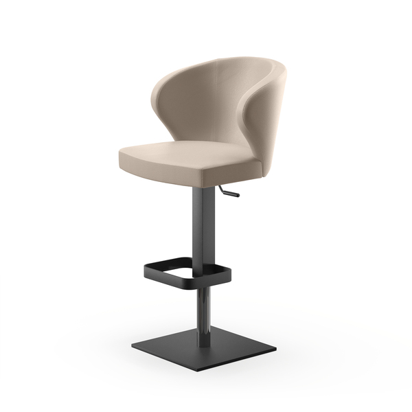 Sgabello regolabile e girevole con zavorra in ghisa ricoperta da copertina in acciaio inox, pistone a gas, poggiapiedi, seduta e schienale in multistrati di faggio ricoperti con gomma poliuretanica e tappezzati in stoffa, finta pelle o vera pelle bovina di origine italiana. Disponibile anche con base fissa in altezza cucina o bar. La parte posteriore dello schienale puo’ essere trapuntata.