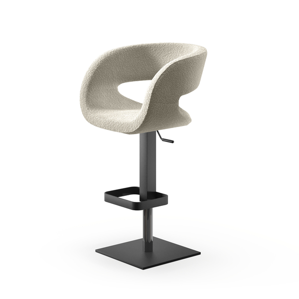 Sgabello regolabile e girevole con zavorra in ghisa ricoperta da copertina in acciaio inox, pistone a gas, poggiapiedi, seduta e schienale in multistrati di faggio ricoperti con gomma poliuretanica e tappezzati in stoffa, finta pelle o vera pelle bovina di origine italiana. La parte posteriore dello schienale puo’ essere trapuntata.