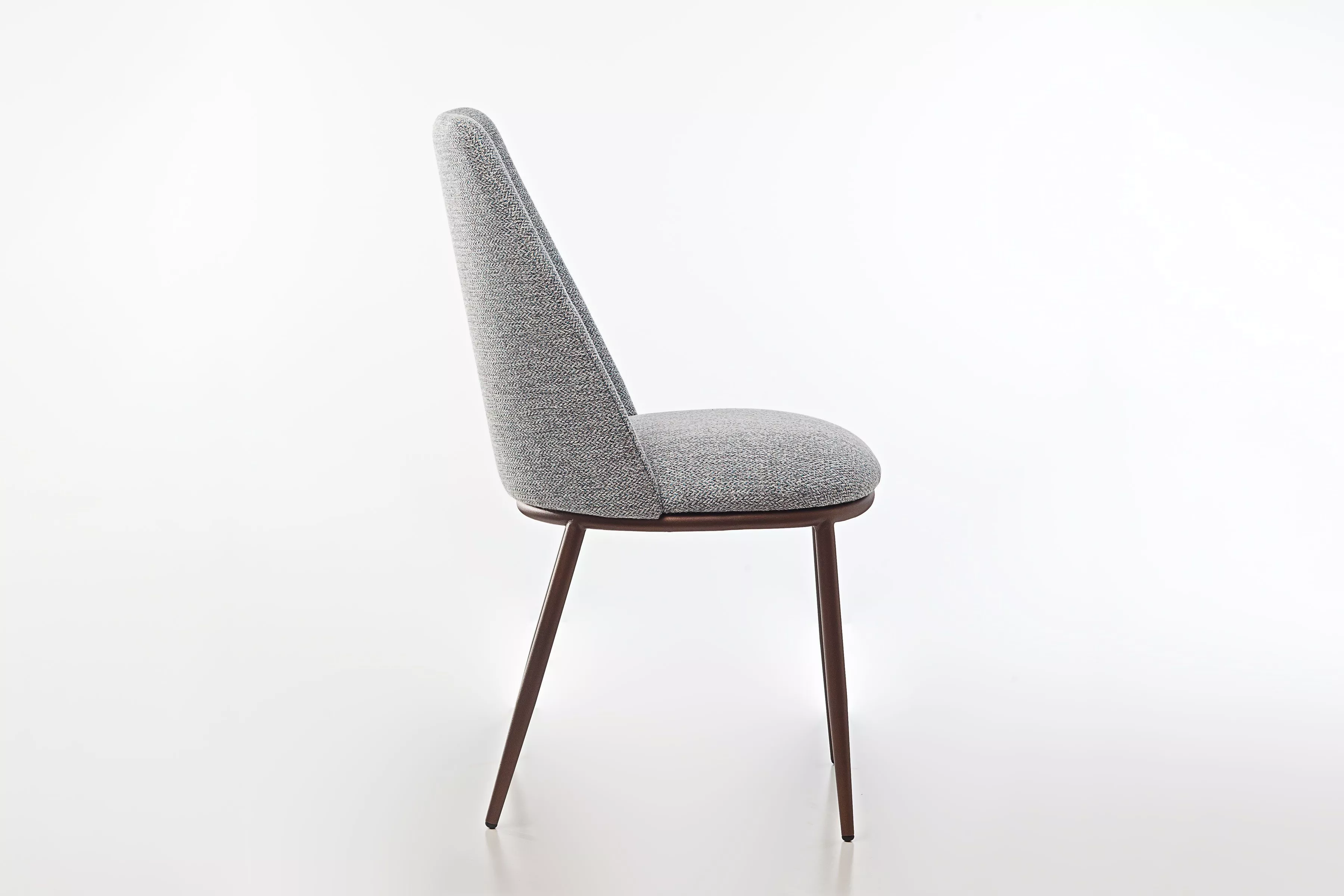 Sedia da sala o da cucina, struttura in acciaio verniciato a polveri epossidiche in varie finiture. Seduta e schienale composti da un pannello in multistrati di faggio e da una struttura in tondino d’acciaio, interamente rivestiti in gomma poliuretanica e tappezzati nelle nostre stoffe, finta pelle e vera pelle bovina.