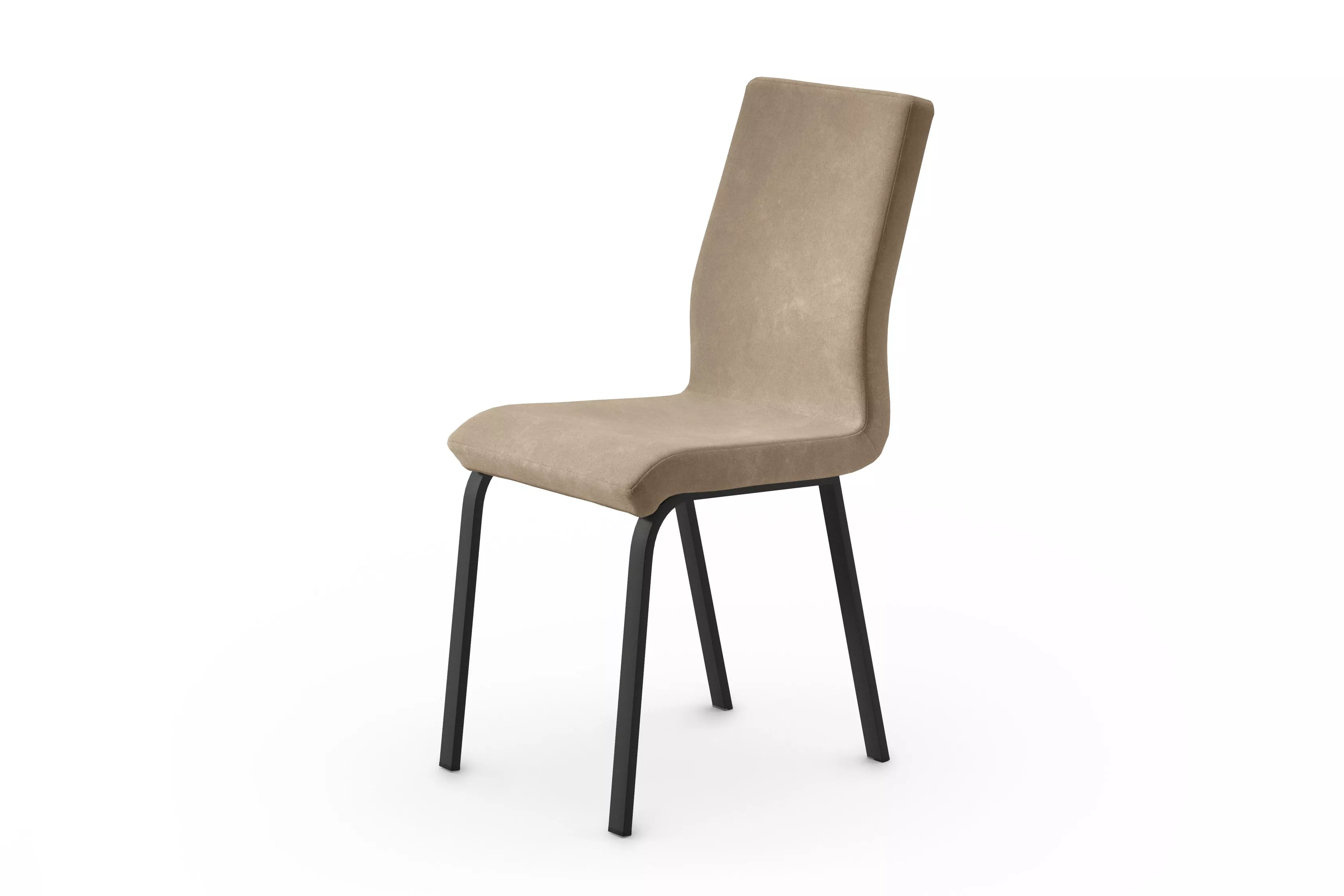 Sedia con scocca in multistrati di faggio, rivestita in gomma poliuretanica e tappezzata in stoffa, finta pelle e vera pelle bovina di origine italiana. Base in tubo d’acciaio a sezione rettangolare. La parte posteriore dello schienale puo’ essere trapuntata.