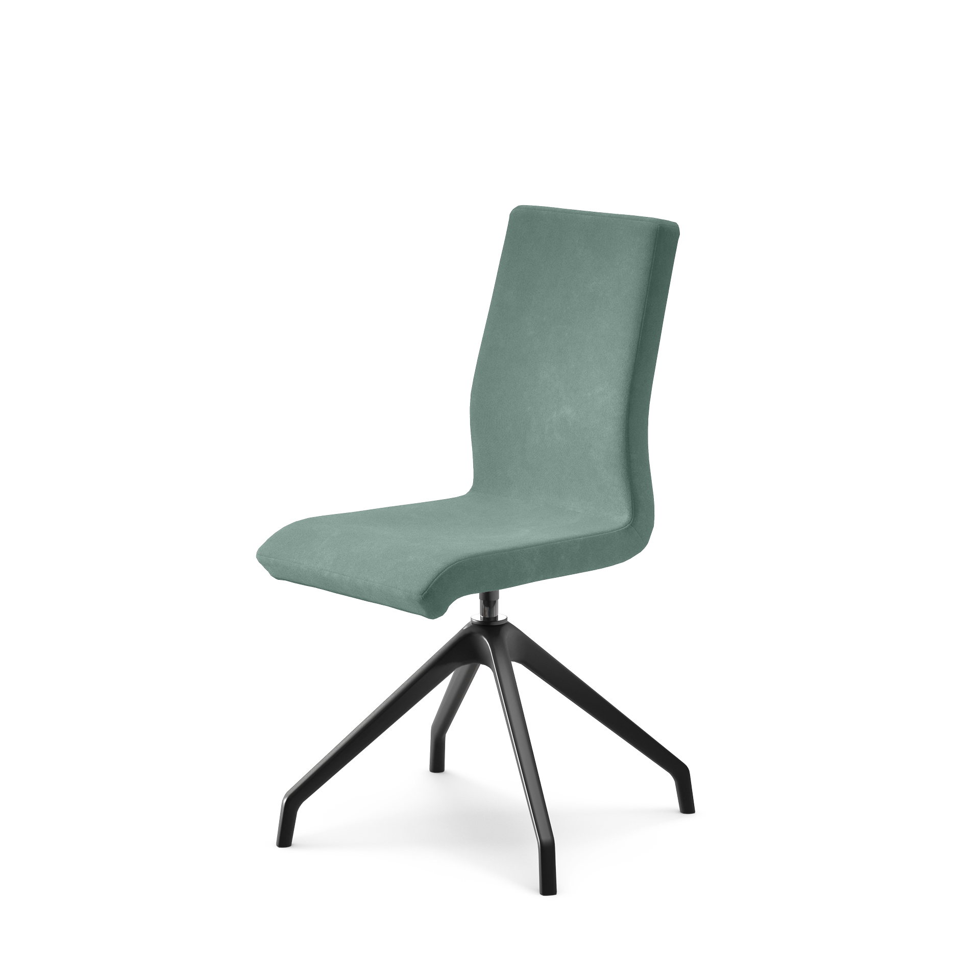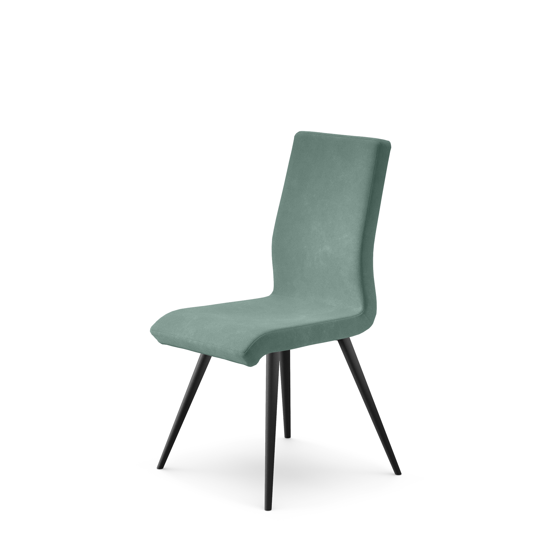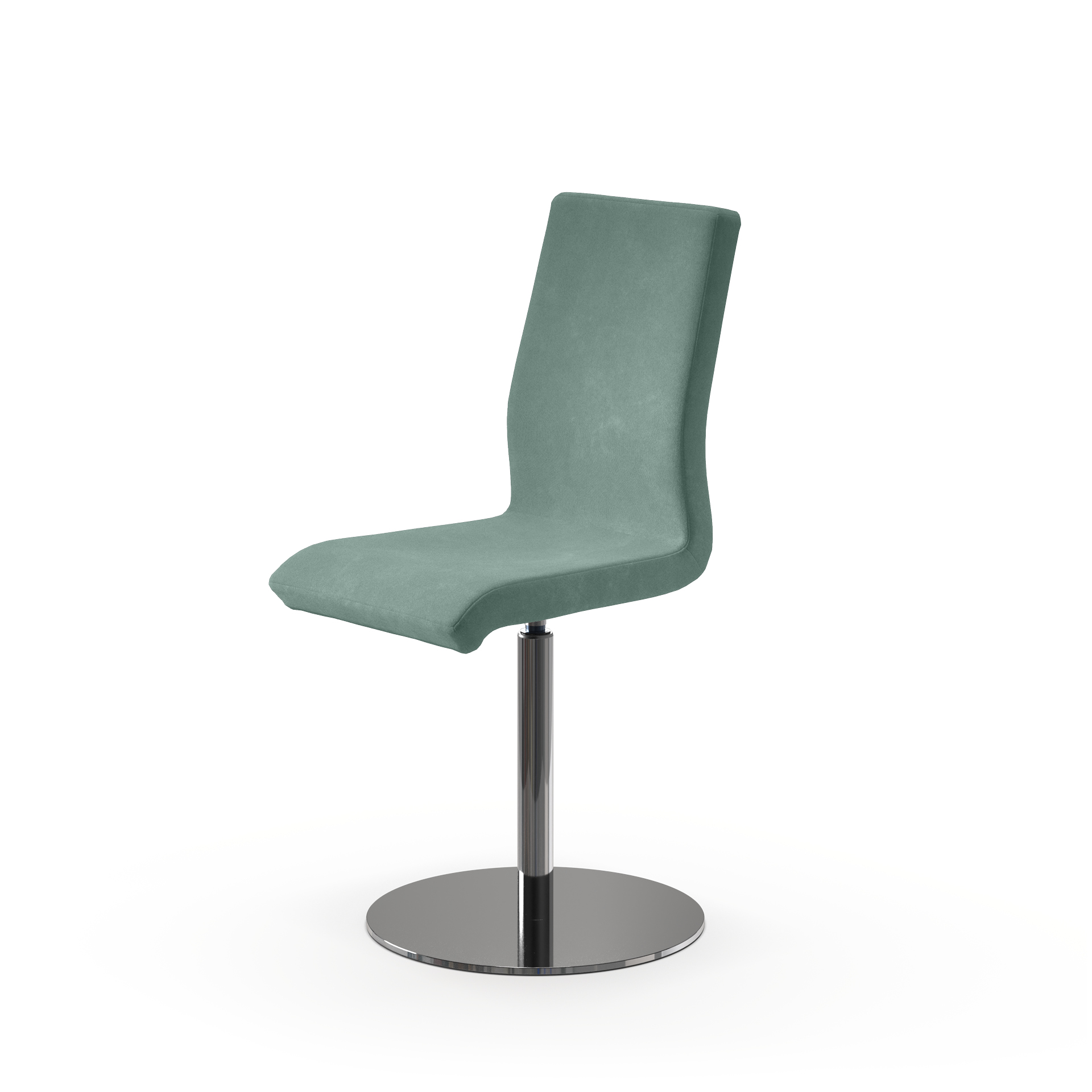 Sedia con scocca in multistrati di faggio, rivestita in gomma poliuretanica e tappezzata in stoffa, velluto, finta pelle e vera pelle bovina di origine italiana. Disponibile con molteplici basi ed in vari materiali e finiture. La parte posteriore dello schienale puo’ essere trapuntata.