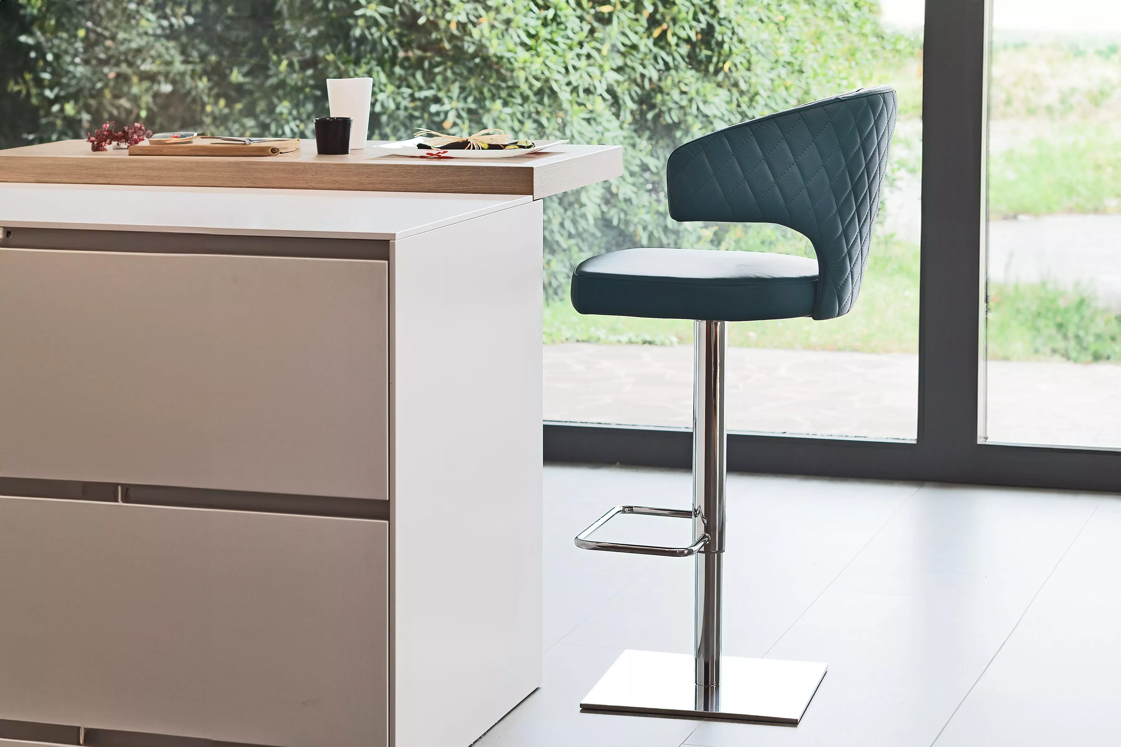 Sgabello fisso o regolabile e girevole con zavorra in ghisa ricoperta da copertina in acciaio inox, pistone a gas, poggiapiedi, seduta e schienale in multistrati di faggio ricoperti con gomma poliuretanica e tappezzati in stoffa, finta pelle o vera pelle bovina di origine italiana. La parte posteriore dello schienale puo’ essere trapuntata.